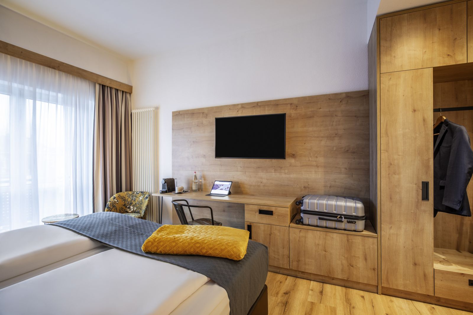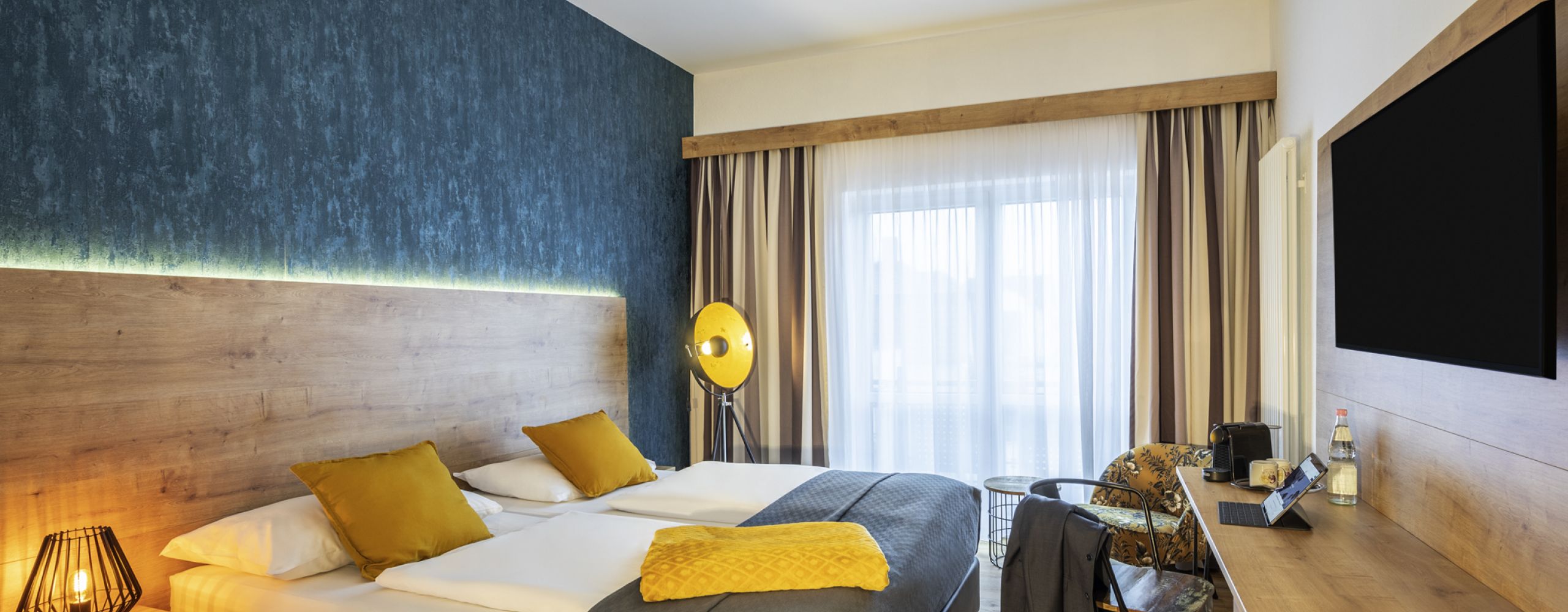 Unsere modernen Zimmer im neuen Design kombinieren Wildeiche mit schwarzen Aplikationen. Sie liegen an der Seitenlinie des Hotels und bieten mit Ihren 2 Betten (90x200), Schreibtisch und Sitzgelegenheit alles was Ihr für einen gelungenen Aufenthalt in Bad Oeynhausen benötigt.